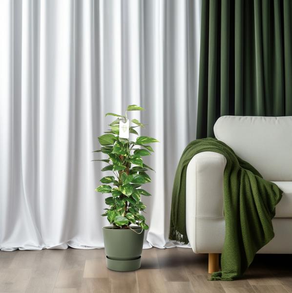 De Epipremnum Pinnatum, algemeen bekend als de Gouden Pothos, is een prachtige kamerplant die een vleugje elegantie toevoegt aan elke ruimte. Deze veelzijdige plant komt oorspronkelijk uit Zuidoost-Azië, waar deze goed gedijt in tropische klimaten. Met zijn levendige goudgroene bladeren in de vorm van een hart, verfraait het niet alleen het esthetische aanzicht van je huis, maar zuivert het ook de lucht, waardoor het een ideale keuze is voor binnentuinen. Gemakkelijk in onderhoud, de Epipremnum Pinnatum is een must-have voor plantenliefhebbers die een vleugje exotisme willen brengen in hun leefruimtes. Epipremnum, ook bekend als Golden Pothos, groeit goed op een plek met halfschaduw en heeft eens per week water nodig. Deze plant geeft de voorkeur aan goed doorlatende grond, zoals een mengsel van veenmos en perliet. Om optimale groei te garanderen, wordt aanbevolen om de plant elke 4-6 weken tijdens het groeiseizoen te bemesten met evenwichtige vloeibare meststof. Te veel bemesten kan leiden tot verbrande wortels, dus het is belangrijk om de instructies op de verpakking van de meststof te volgen en overmatige hoeveelheden te vermijden.Fun Fact: Epipremnum Pinnatum, algemeen bekend als Duivels Klimop of Pothos, is niet alleen een visueel prachtige plant voor thuisdecoratie, maar ook een uitstekende luchtzuiveraar! Door zijn vermogen om gifstoffen uit de lucht te verwijderen, heeft het een plek verdiend op de lijst van top luchtzuiverende planten van NASA. Het is echter belangrijk om te onthouden dat hoewel deze charmante plant je leefruimte kan verbeteren, Duivels Klimop niet geschikt is voor consumptie. Dus geniet van zijn schoonheid, maar vergeet niet om het uit je saladekom te houden!- Epipremnum Pinnatum, ook bekend als Gouden Pothos, is een populaire kamerplant met een potmaat van 19 cm.- Deze mooie plant kan groeien tot ongeveer 80 cm hoog, waardoor het een geweldige keuze is voor zowel kleine als grote ruimtes.- Epipremnum Pinnatum gedijt het beste op een plek die gedeeltelijke schaduw of halfschaduw ontvangt, waardoor het veelzijdig is voor verschillende binnenomgevingen.- Het is interessant om te weten dat Epipremnum Pinnatum bekend staat om zijn luchtzuiverende eigenschappen en effectief giftige stoffen uit de omgeving kan verwijderen.- Met zijn glanzende bladeren en gemakkelijke verzorging is deze plant niet alleen visueel aantrekkelijk, maar ook onderhoudsarm, perfect voor beginnende tuiniers.