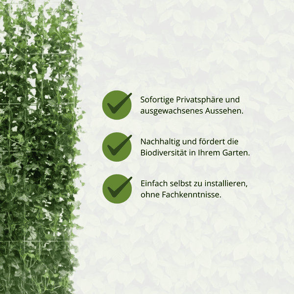 Weer- en Vervuilingsbestendig: Net als de traditionele Hedera Hibernica, is deze kant-en-klare haag bestand tegen zowel lage temperaturen als stedelijke vervuiling, wat het een ideale keuze maakt voor zowel landelijke als stedelijke tuinen.
