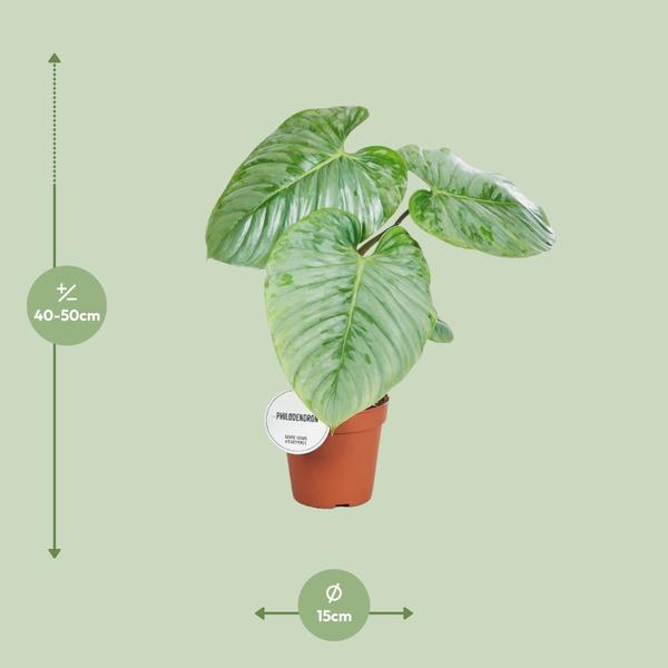 Deze Philodendron wordt geleverd in een potmaat van 15 cm, perfect voor gemakkelijke plaatsing en verzorging.