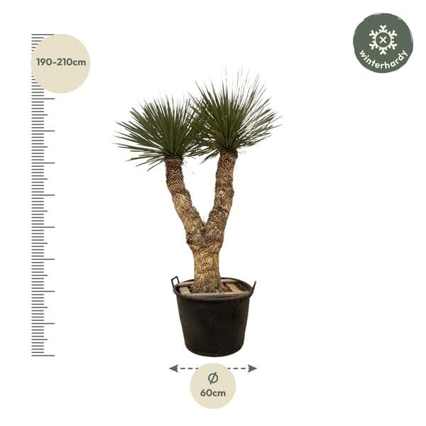 • Uiterlijk van de Yucca Rostrata: De Yucca Rostrata heeft dunne, blauwe tot grijsgroene bladeren die een sierlijke rozet vormen. De bladeren zijn stevig en kunnen een spitse vorm hebben, wat de plant een scherpe uitstraling geeft. De stam is verhout en dikker in de basis, met een unieke, ruwe textuur die bijdraagt aan de robuuste uitstraling van de plant.
